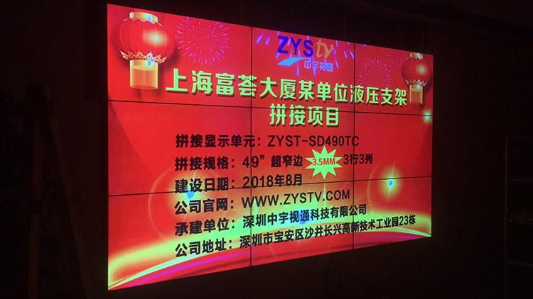 上海富薈大夏某單位49寸液壓支架拼接屏項目采用中宇視通科技大屏液晶拼接方案,項目安裝調試完成并順利簽收。