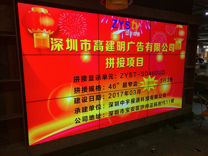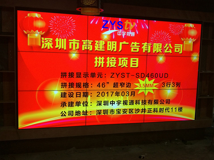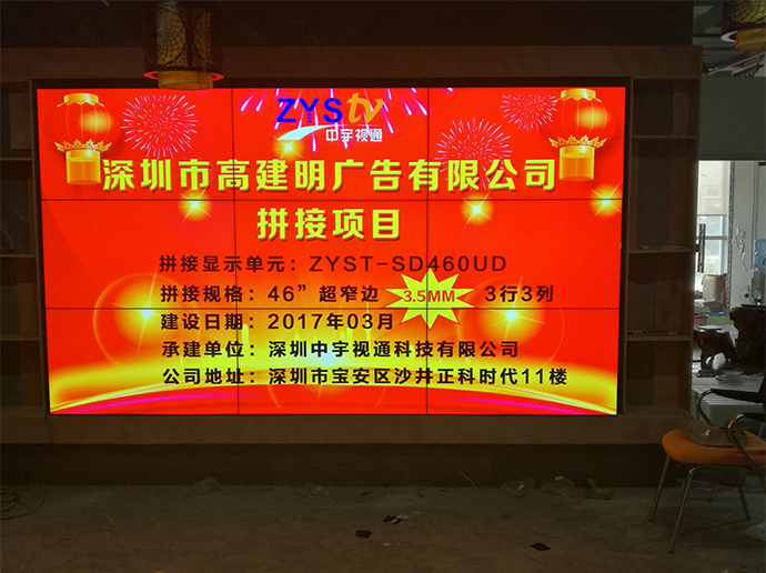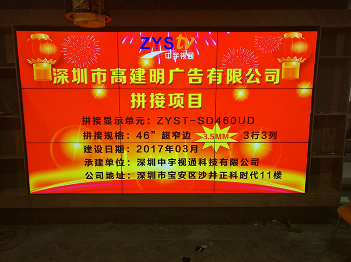 拼接項目:深圳市高建明廣告有限公司拼接單元:ZYST-SD460UD拼接拼縫:3.5mm拼接規格:3*3拼接尺寸:46寸拼接屏安裝方式:壁掛承建地址:深圳市高建明廣告有限公司承建日期:2017年3月承建單位:深圳中宇視通科技有限公司