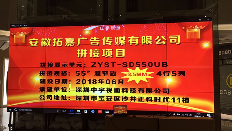 安徽九鼎傳媒有限公司此次選用中宇視通科技55寸4行5列3.5mm拼縫拼接屏項目,項目順利安裝調(diào)試完成,并且此次九鼎傳媒還會與中宇視通達成深切合作及達成長期戰(zhàn)略合作。