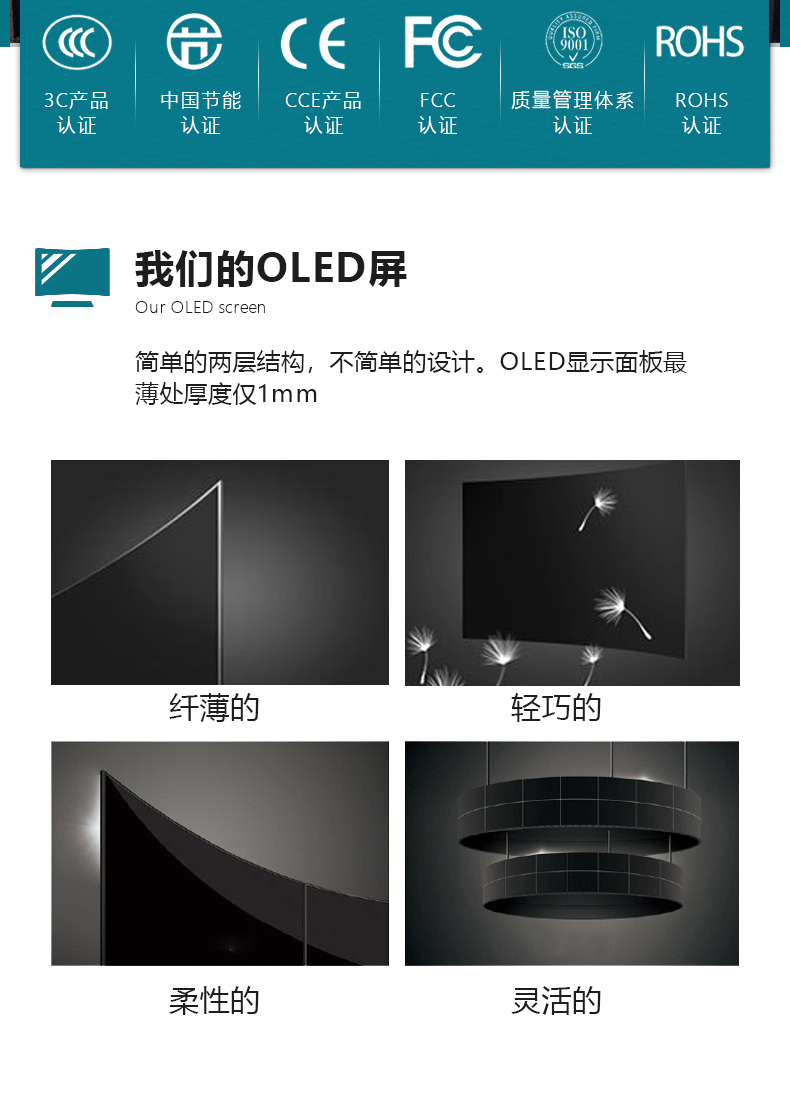 OLED柔性拼接屏是一種采用機發光半導體,通過注入載流子和復合導致發光的一種技術,是一種在電場驅動下利用多層有機薄膜結構產生電致發光的器件,并且引入了液晶拼接屏可拼接的性能,實現大屏幕顯示;OLED柔性拼接屏采用最新的OLED顯示技術,面板超輕、超薄,可彎曲,支持弧形、曲面拼接。